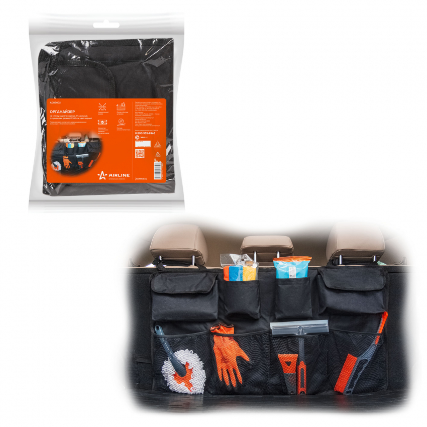 Применяется для компактного размещения различных аксессуаров в багажнике автомобиля. Крепится за подголовники заднего сиденья при помощи регулируемых фастексов. Закрывает всю площадь спинки. Имеет 8 вместительных карманов.