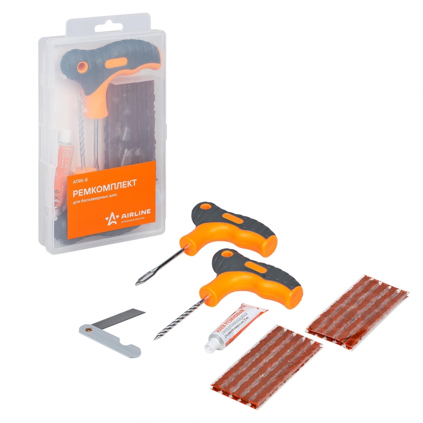 Ремонтный комплект поможет произвести экстренный ремонт шин. В наборе представлены инструменты с витым и с игольчатым наконечником, а также 10 штук жгутов сырой резины длиной 10 см. Набор является бюджетным вариантом оказания ремонтных услуг с базовым комплектом необходимых инструментов. С помощью инструмента c наконечником напильником зачищается место прокола. С помощью инструмента с игольчатым отверстием прокол заделывается жгутом из сырой резины, на который предварительно наносится клей активатор. Пару минут ожидания и можно ехать!