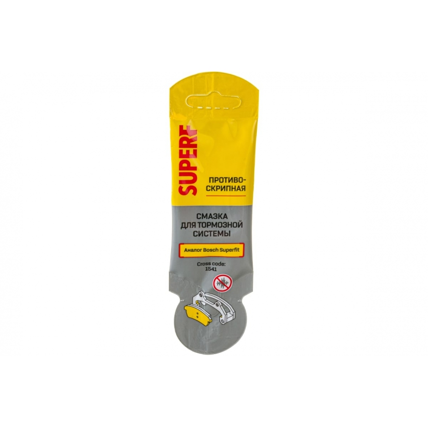 SUPER F — смазка на минеральной основе, загущенной бентонитом. Противоскрипная, высокотемпературная, антикоррозионная, без порошковых наполнителей. Предназначена для нерабочих поверхностей тормозных колодок и посадочных мест. Не совместима с резиновыми деталями.